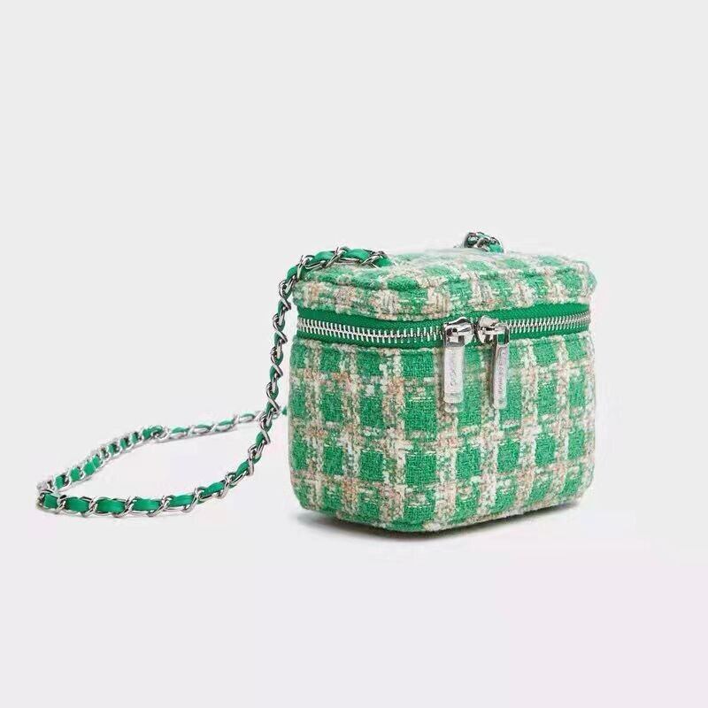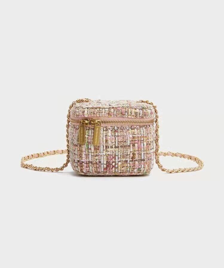 ・ミックスカラーのツイード調マイクロミニチェーンバッグ。