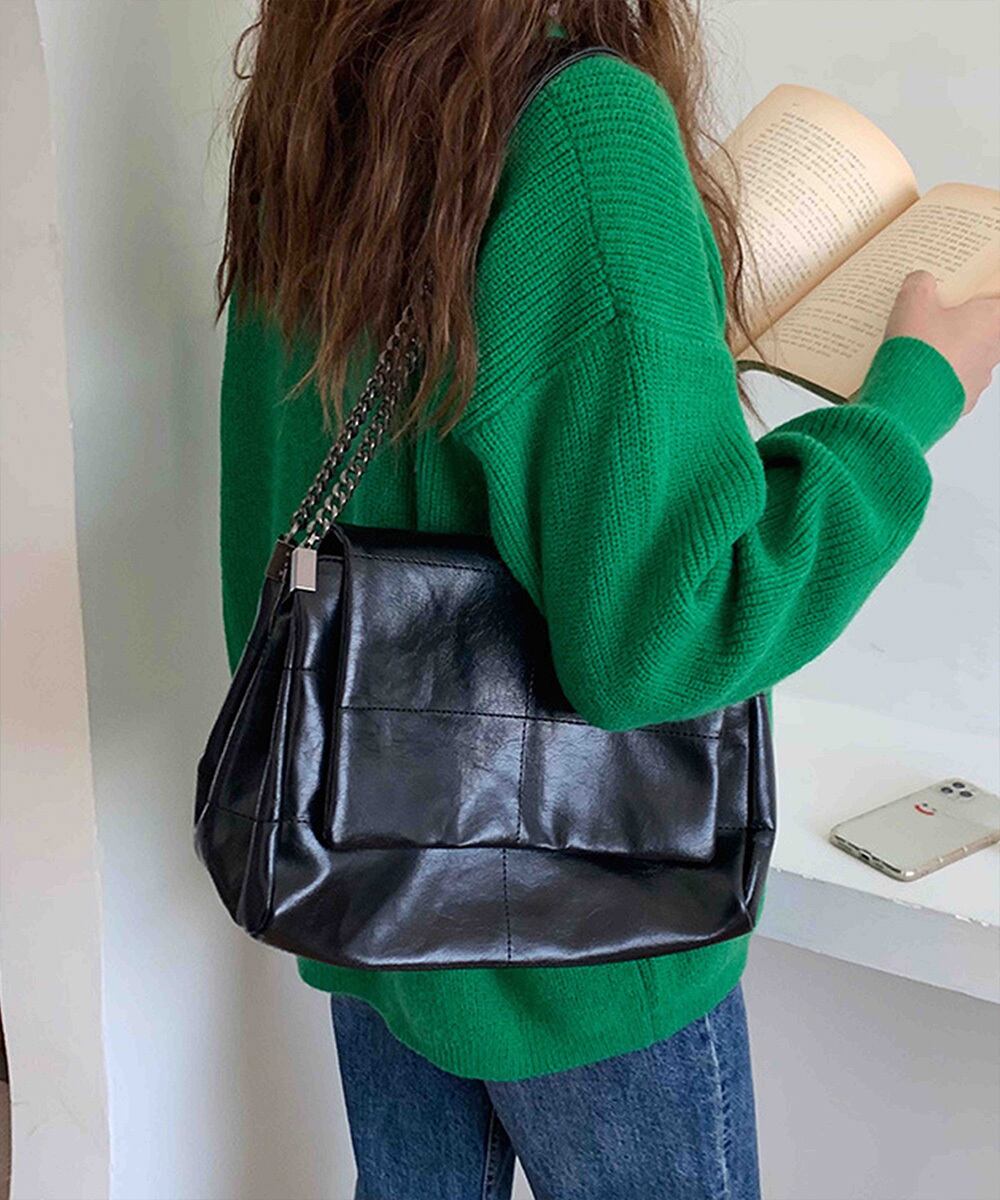 ステッチが施されたシックなボディが特徴の、個性的なフラップ式ショルダーバッグです。