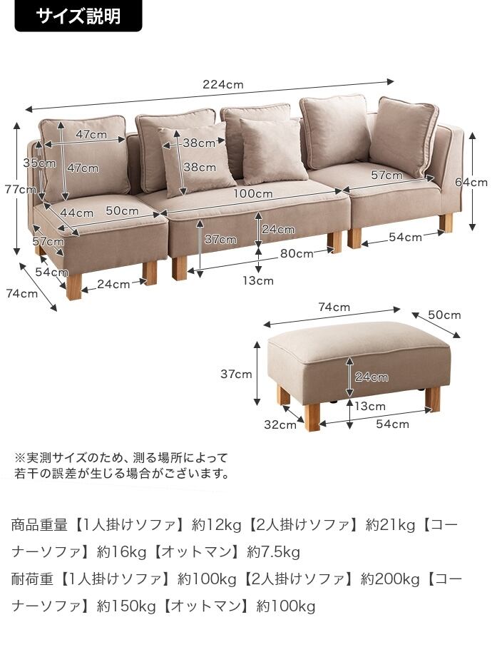 【耐荷重】1人掛けソファ:約100kg、2人掛けソファ:約200kg、コーナーソファ:約150kg、オットマン:約100kg