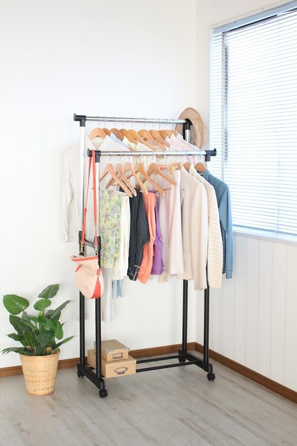 前後2列のバーに洋服をたっぷり掛けられるのでダブル収納ハンガーラック。