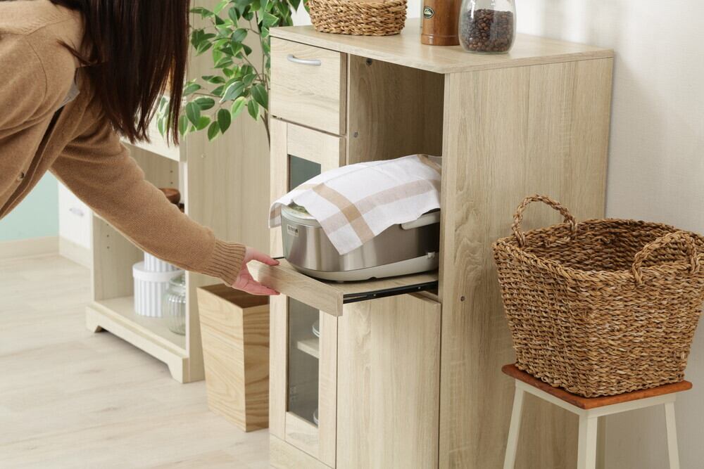 炊飯器やトースターなどのコードを通す穴があり、配線もラクラクです。